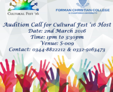 Auditions for performances in Cultural Festival 2016 will be conducted on Wednesday 02 March 2016 in S-009 from 01:00 pm to 03:30 pm. Those who are interested to participate are requested to be present on the venue and the mentioned date and...