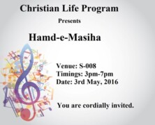 Christian Life Program is holding Hamd-e-Masiha on Tuesday 03 May 2016 from 03:00 pm to 07:00 pm in S-008. Please join...