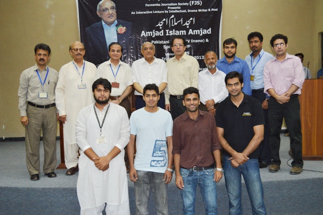 The Formanite Journalism Society organized a lecture on Pakistani Media (TV drama) and Social Values on Friday 3 May 2013. The guest speaker at the occasion was renowned columnist, poet, and drama writer, Amjad Islam Amjad. The lecture was attended by various faculty members and students.