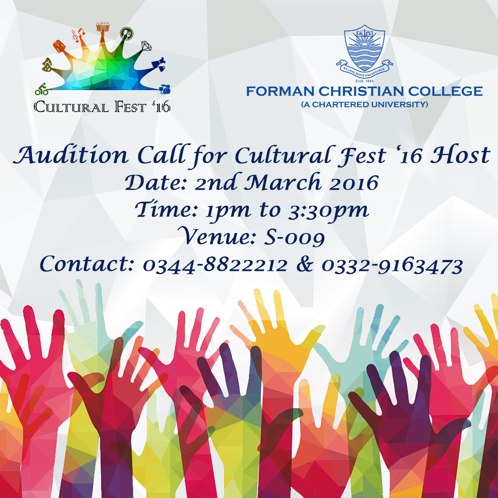 Auditions for performances in Cultural Festival 2016 will be conducted on Wednesday 02 March 2016 in S-009 from 01:00 pm to 03:30 pm. Those who are interested to participate are requested to be present on the venue and the mentioned date and time.