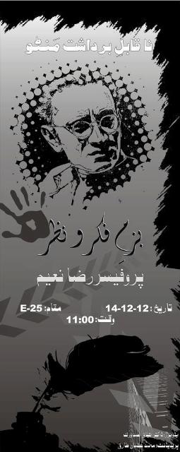Bazm-e-Fikr-o-Nazar organized a lecture by Raza Naeem on 14 December 2012. The topic of the lecture was “Naqabil-e-Bardasht Manto”. The year 2012 was dedicated to the centennial anniversary of the birth of the great Pakistani writer and social critic, Saadat Hasan Manto (1912-55). The guest intelligently covered the literary achievements of Saadat Hasan Manto who analyzed the society and psyche of human beings in a realistic way. Students from different departments especially English, Urdu, Sociology and Psychology attended the lecture with great interest.