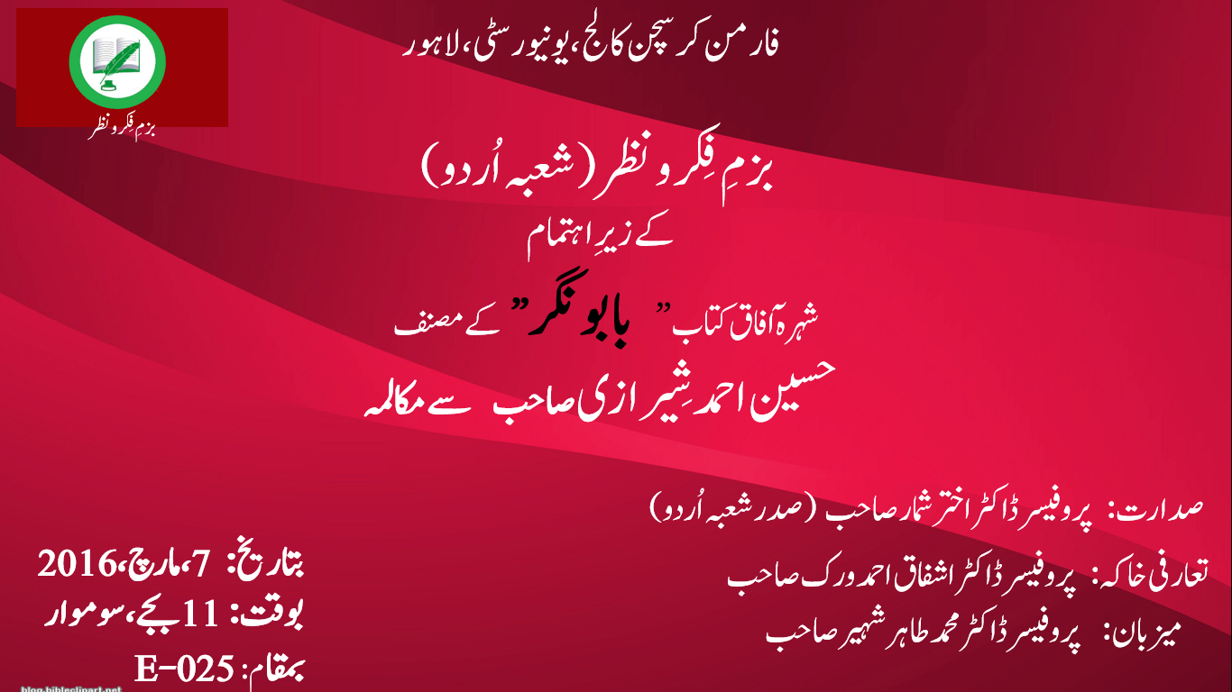 Bazm-e-Fikr-o-Nazar is going to arrange a lecture on Satire & Humor in Urdu Literature by Hussain Ahmed Sherazi in E-025 on Monday 07 March 2016 at 11:00 am. Please join us.