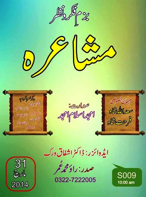 Bazm-e-Fikr-o-Nazar will hold a mushaira on Monday 31 March 2014, at 10:00 am in S-009. All students, staff and faculty are welcome to attend.