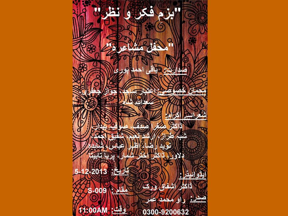Bazm-e-Fikr-o-Nazr invites you to its Mehfil-e-Mushaira on Thursday 5 December 2013 in S-009 at 11:00 am.