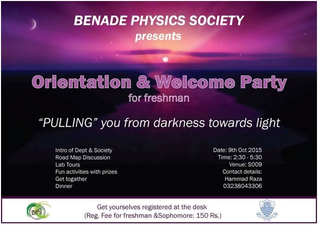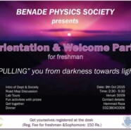 Benade Physics Society organized orientation for all physics majors and welcome ceremony for all Physics freshman on 9 October 2015. Events included a guide through Physics major road maps, introduction to department and society, and lab tours. All of these were arranged to ease new students through the journey they have begun and give them a clear view of what studying physics at FCC is all about. This followed some fun activities, a get together and a dinner which served as a platform for students to interact with teachers.