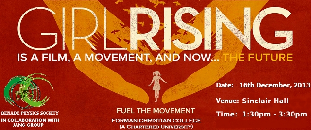 The Benade Physics Society, in collaboration with the Jang Group presents the Screening of “Girl Rising’ – a film about the power of education to transform societies. This film is the part of a campaign for girls’ education powered by girls, women, boys and men around the world who stand for equality. For more information about the film please visit http://www.girlrising.com/