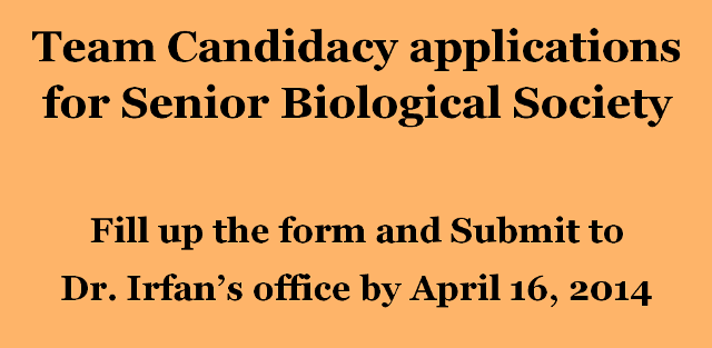 Students who are majoring in Biotechnology or Biological Sciences, who are interested in being a part of Senior Biological Society Team ‘14, can get the application form from this link, fill it out and submit it to Dr Irfan’s office by 16 April. No applications will be accepted after the 16th.