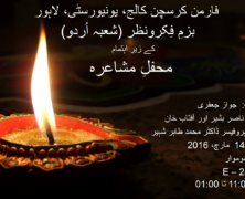 Bazm-e-Fikr-o-Nazar Society arranged Mehfil-e-Mushaira on 14 March 2016 in E-025 in which Dr Jawaz Jafari, Nasir Basir, Victoria Patrick and Aftab Khan were the special guests who delivered their poetry to the audience and were equally accepted by the students of FCC. Dr Akhtar Shumar,...