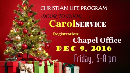 Join us as we go from door to door on the FCCU campus on Friday 09 December 2016 from 05:00 pm to 07:00 pm singing Christmas carols. Register yourselves before the day at the chapel office with Rs 150 for the dinner (optional). The dinner will ne from 07:00 pm to 08:00 pm.
