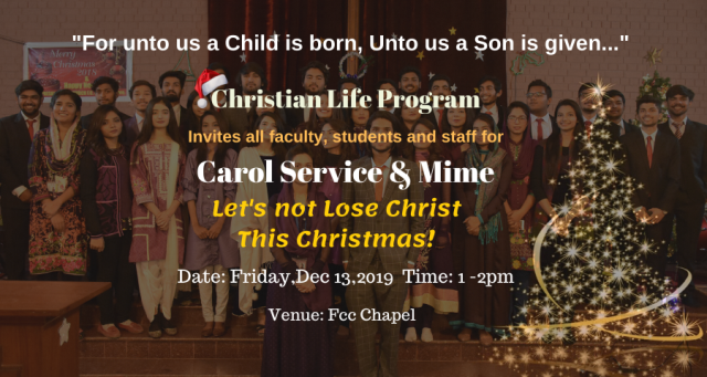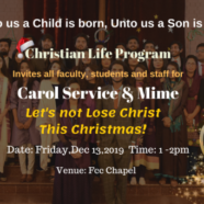 Christian Life Program invites all faculty, staff, and students for Carol Service and Mime on Friday 13 December 2019 from 01:00 pm to 02:00 pm in FCCU Chapel.