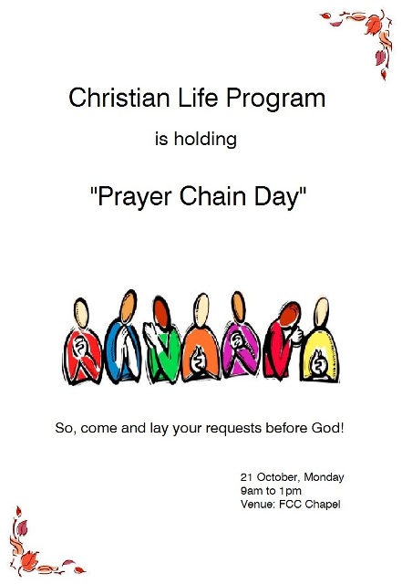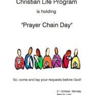 Christian Life Program is arranging ‘Prayer Chain Day’ for both Intermediate and Baccalaureate students on 21 October 2019 from 09:00 am to 01:00 pm in FCCU Chapel.