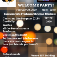 The Christian Life Program will hold a Welcome Party for Christian Baccalaureate Freshmen students on Monday 24 February 2020 from 01:00 pm to 02:00 pm in ICF Education Building.