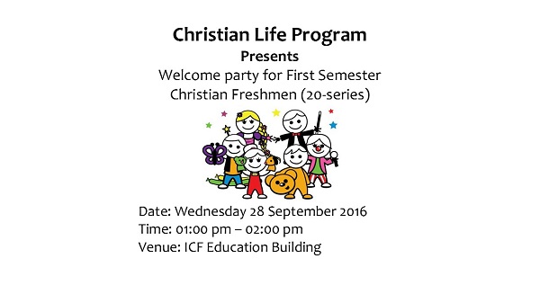 The Christian Life Program will hold a Welcome Party for Christian Baccalaureate Freshmen (20- Series) students on Wednesday 28 September 2016 at 01:00 pm in ICF Education Building.