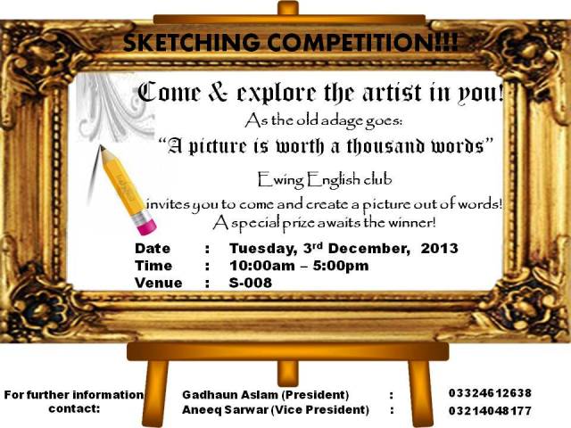 The Ewing English Club invites you to participate in its Sketching Competition on Tuesday 3 December 2013 from 10:00 am to 5:00 pm in S-008