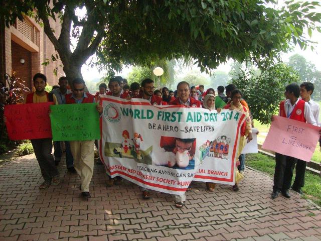 Emergency Services (A Project of Red Crescent Youth Group FCC) arranged an awareness walk to commemorate World First Aid Day on 16 September 2014 in collaboration with the Pakistan Red Crescent Society. Dr C J Dubash was the Chief Guest at the walk which started from the Intermediate Cafe, moving towards N-Block, E-block, S-block and turning back towards N-block.