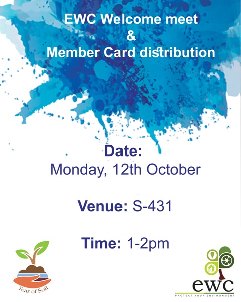 Team EWC cordially invites all new members and freshmen to the EWC Welcome Meet on Monday 12 October 2015Join us for a brief introduction of our amazing initiatives planned for this year. Official EWC membership cards will be disturbed at the end of the event.