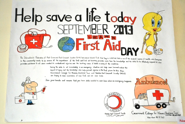The Punjab Emergency Service (Rescue 1122) in collaboration with the Pakistan Red Crescent Society (PRCS) arranged the seminar on Annual First Aid Day, on 14 September, 2013. The Emergency Response Team of FCC also joined the event. First Aid Day is celebrated on the second Saturday of September and this year it was marked at 14 September. The seminar was arranged to spread awareness and responsibility among the people about first aid and road safety at the PRCS auditorium at Shahar-e-Fatimah Jinnah. PRCS had also arranged First Aid Safety Painting Competition among schools on this day.
