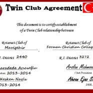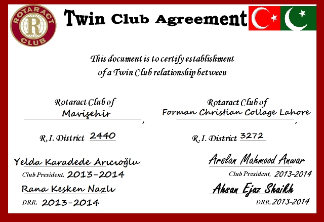 The Rotaract Club of Forman Christian College signed a Twin Club Agreement with Turkish club “Rotaract Club of Mavisehir” of district R.I 2440 in September 2013. The agreement will help build a strong relationship between the two clubs to complete a special program, to emphasize the international aspects of Rotaract service and fellowship and to enhance the understanding of another culture.