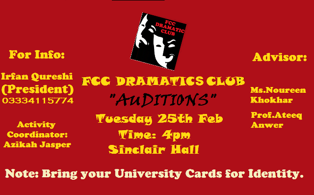 Auditions for performances in Inter-University Drama Festival 2014 will be conducted on 25 February 2014 in Sinclair Hall at 4:00 pm. Students are requested to bring their university cards with them for the auditions. The advisers of the club and the FDC office bearers will supervise the auditions. The decisions made by the panel will be final and cannot be challenged.