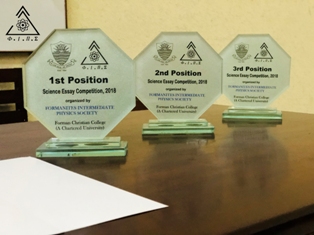 The Formanites Intermediate Physics Society (FIPS) organized a Science Essay Writing Competition in October 2018. The topics provided to students in this competition for essay writing included ‘The Big Bang Theory’, ‘Human Colonization of Mars’ and ‘Earthquakes and Volcanoes’. A large number of students participated in the competition. An Appreciation Ceremony was held on November 15, 2018 in P-020 Auditorium to present the participants with participation certificates and the position holders with shield and souvenirs. The certificates were awarded to the participants by the honorable Vice Rector (I), Prof Dr Cusrow J Dubash and Head of Physics Department, Prof Mohammad Iqbal.