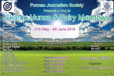 Forman Journalism Society is organizing a 9 days trip to Skardu, Hunza and Fairy Meadows from 27 May 2016 to 04 June 2016