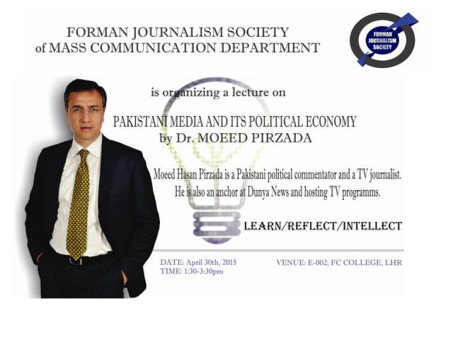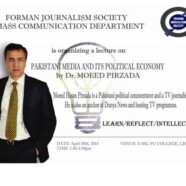 The Forman Journalsim Society is organizing a lecture by a well known journalist, columnist, blogger and intellectual, Dr Moeed Pirzada on ‘Pakistani Media And its Political Economy’ (Industry Issues of Monopoly and Revenue).The event is scheduled on Thursday 30 April 2015 at from 1:30 pm to 3:30 pm in CPPG’s conference room.