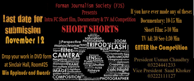Forman Journalism Society (FJS) along with Mass Communication Department brings an excellent opportunity for young and aspiring filmmakers and videographers. Short Shorts, an Intra FCC Short Film, Documentary and TV ads Competition is going to be held on 28 November, 2013.