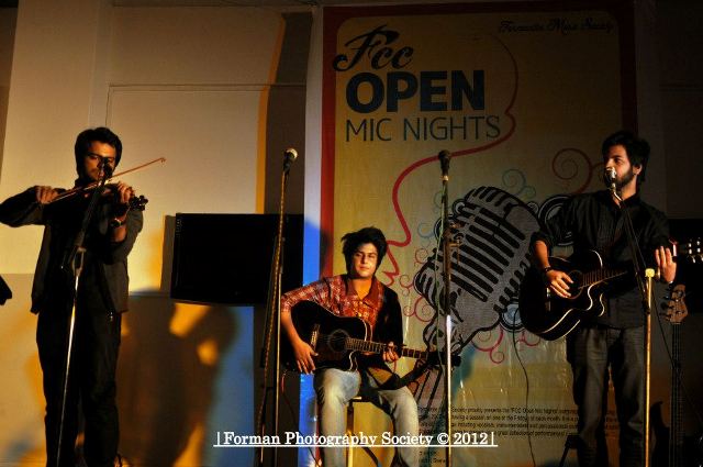 The Formanite Music Society organized its first ever Open Mic Night on 7 December 2012 at E-025, that was attended by baccalaureate students and some faculty members. It was a musical evening where musicians from all over the university, who specialized in various music genres came together as the Formanite ‘House Band’ to create innovative renditions of popular songs. The event was made possible through the diligent work of the society’s management. Ali Abbas (Society President), Shahrukh Sherwani (General Secretary/Director) and Hamza Butt (Event Manager/Directors) advertised for auditions to recruit a diverse array of musicians to constitute the House Band.