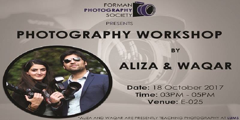 Forman Photography Society presents a workshop with the amazingly talented Aliza and Waqar, Photography professionals and teaching enthusiasts, on Wednesday 18 October 2017  from 03:00 pm to 05:00 pm in E025. From wedding coverage to detailing lifestyle, fashion and travel logs to teaching at LUMS, this dynamic duo can do it all. So don’t miss out on the chance to learn from two of the skilled professionals in the industry in an event organized especially for all those who want to begin with the basics.