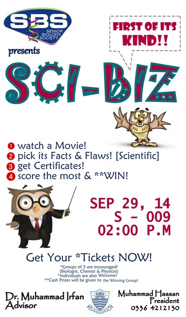 At Sci-Biz, participants will be shown a sci-fi movie and will be asked to identify scientific facts and flaws in it. A panel of judges, comprising instructors from departments of Biological Sciences, Chemistry and Physics will judge the arguments put forth by the participants. The wining group will be awarded a cash prize. Certificates will be given to all participants.
