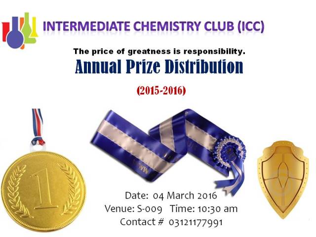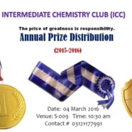 Intermediate Chemistry Club is organizing its annual Prize Distribution Ceremony ’16 on Friday 04 March 2016 at 10:30 am in S-009. Prizes will be distributed among the winners of Green Chemistry Poster Competition, ICC Quiz Competition 2016 and office bearers of ICC.
