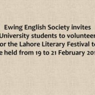 Ewing English Society invites University students to volunteer for the Lahore Literary Festival to be held from 19 to 21 February 2016 in Al-Hamra Arts Complex. The volunteers are required to participate from 09:00 am to 06:00 pm for all the 3 days with a lunch break in between.