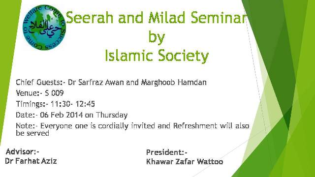 The Islamic Society is organizing a Seerah and Milad seminar. The guest speakers will be Dr Sarfraz Awan and Marghoob Hamdan.