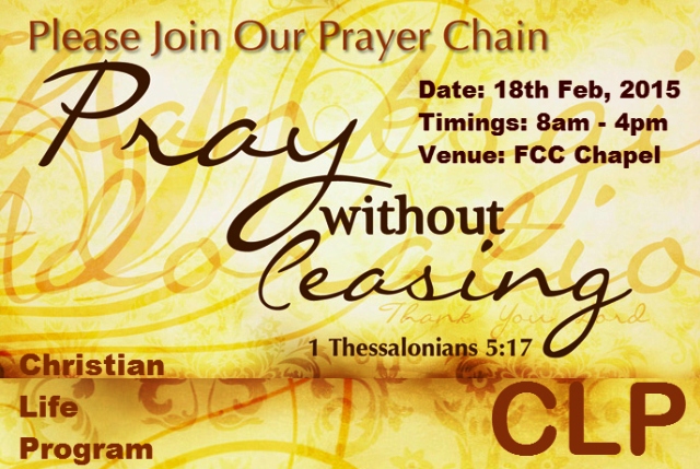 The Christian Life Program invites you to attend its Prayer Chain on 18 February 2015 from 8:00 am to 4:00 pm in the FCC Chapel.