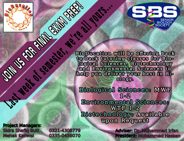 The Senior Biology Society (SBS), BioDucation will be offering back to back tutoring classes for students majoring in Biological Sciences, Biotechnology and Environmental Sciences in the last week of the semester to help the students deliver their best in Biology.