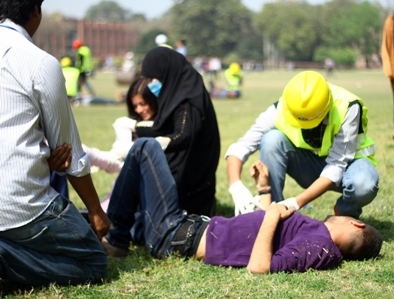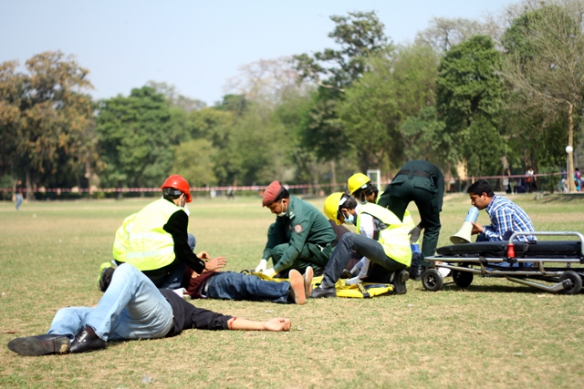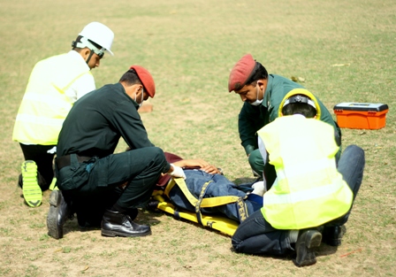 The demonstration comprised of first aid and pre-hospital treatment to victims in case of an emergency. The demonstration was arranged to show how a trained community rescuer can handle a disaster before the arrival of Rescue 1122 and how that can help to increase the number of lives saved.