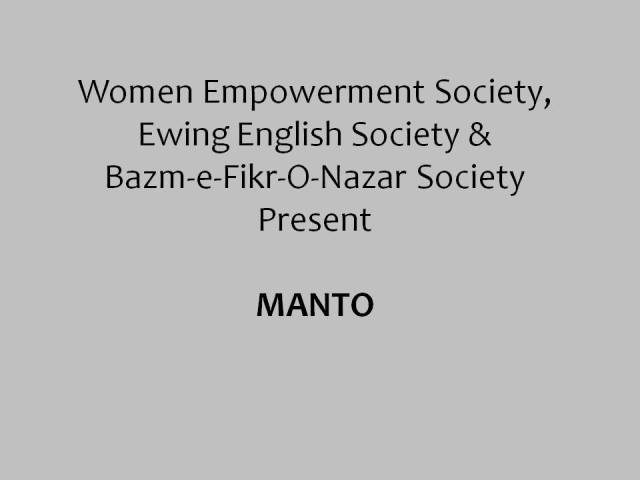 The Women Empowerment Society, Ewing English Society and Bazm-e-Fikr-O-Nazar Society are collectively organizing the event, MANTO. The intricacies of his writings will be studied with none other than Nusrat Jalal, Nuzhat Arshad and Nighat Patel, his daughters along with the esteemed Mr Shujaat Hashmi. The best of Manto’s works will be discuss with the ones who knew him the most. Join us to understand the brilliance of one of the most famous writers Pakistan has ever seen.
