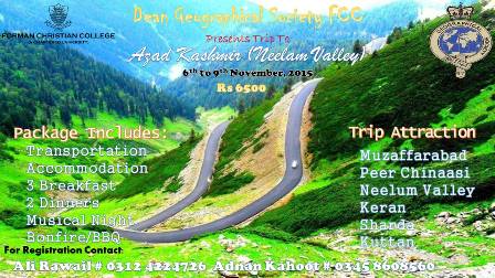 Dean Geographical Society is taking trip to Azad Kashmir. The trip will be visiting Peer Chinasi, Khuttan, Sharda and Neelam Valley. There will be BBQ, bonfire and musical night. The last date to register is Wednesday 4 November 2015.