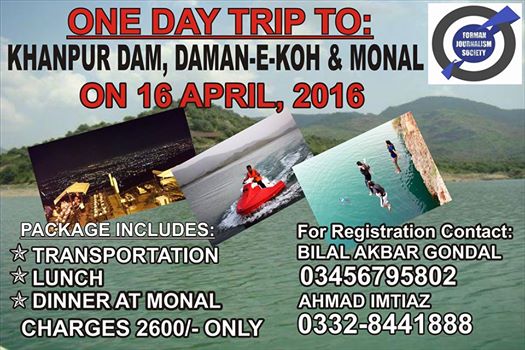 Forman Journalism Society arranges one day trip to  Khanpur Dam, Damn-e-Koh and Monal on Saturday 16 April 2016.