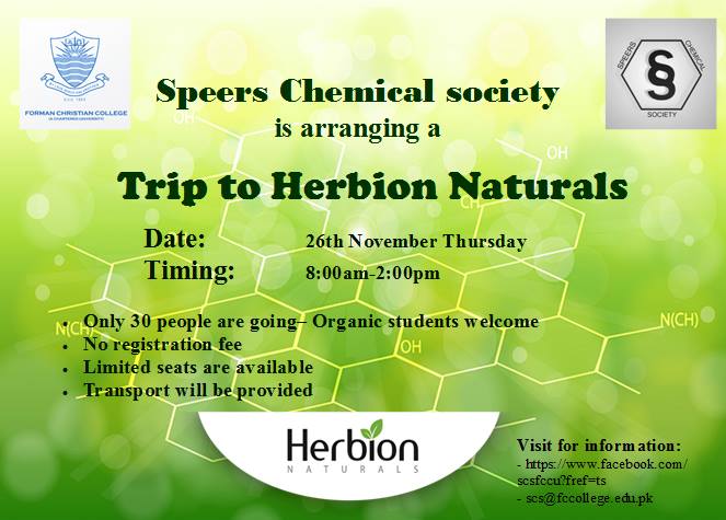 Speers Chemical Society is arranging a study tour to one of the emerging Chemical Industries Herbion Naturals on Thursday 26 November 2015 from 08:00 am – 02:00 pm. This study tour is free for students and faculty of the Chemistry Department. Organic Chemistry students are especially encouraged to join. All others would be registered on first come and first served basis.