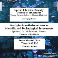 Speers Chemical Society is hosting a lecture on Strategies to Optimize Returns on Scientific & Technological Investments. The topic will be presented by our honorable speaker, Dr Muhammad Farooq from the University of Washington, USA.