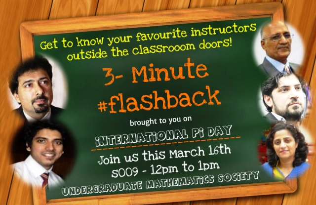 Undergraduate Mathematics Society brings you the 3-Minute #flashback, an incredibly exciting event where members of FCC’s faculty, from five different departments, will be invited to talk about their respective fields and share any of their memorable life experiences. This session will help you with priceless tips, advise and suggestions.
